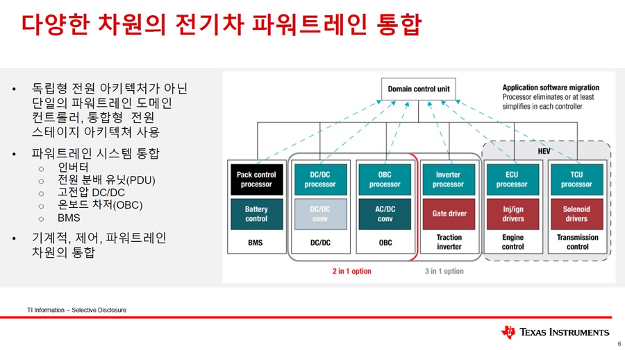 텍사스 인스트루먼츠(이하 TI)는 이러한 상황에서 전기차 파워트레인의 개별 설계가 아닌 통합 설계를 통해 제조 단가를 낮추고 쉬운 설계를 가능케 한다. 특히 부품 수를 줄여 안전에 대한 신뢰성을 높이는 것이 특징이다. 또한, 50% 수준의 다운사이징을 통해 전력 효율을 보장하고 유연한 설계가 가능토록 한다고 TI는 밝히고 있다.