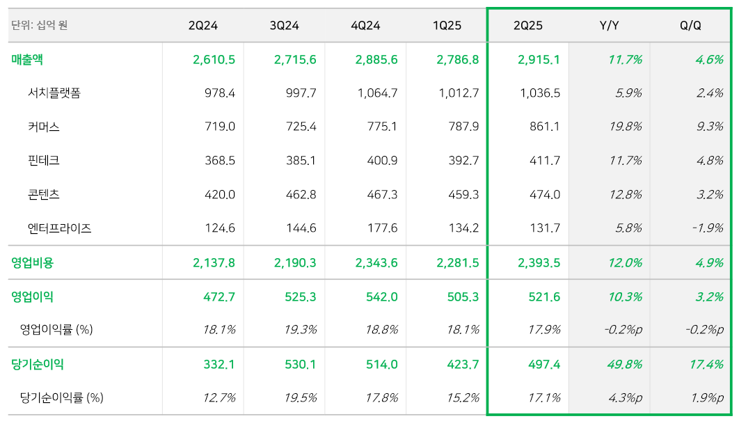 네이버는 2025년 2분기 연결 기준 매출이 전년 대비 11.7% 늘어난 2조 9151억원, 영업이익이 10.3% 증가한 5216억원이라고 8일 밝혔다.