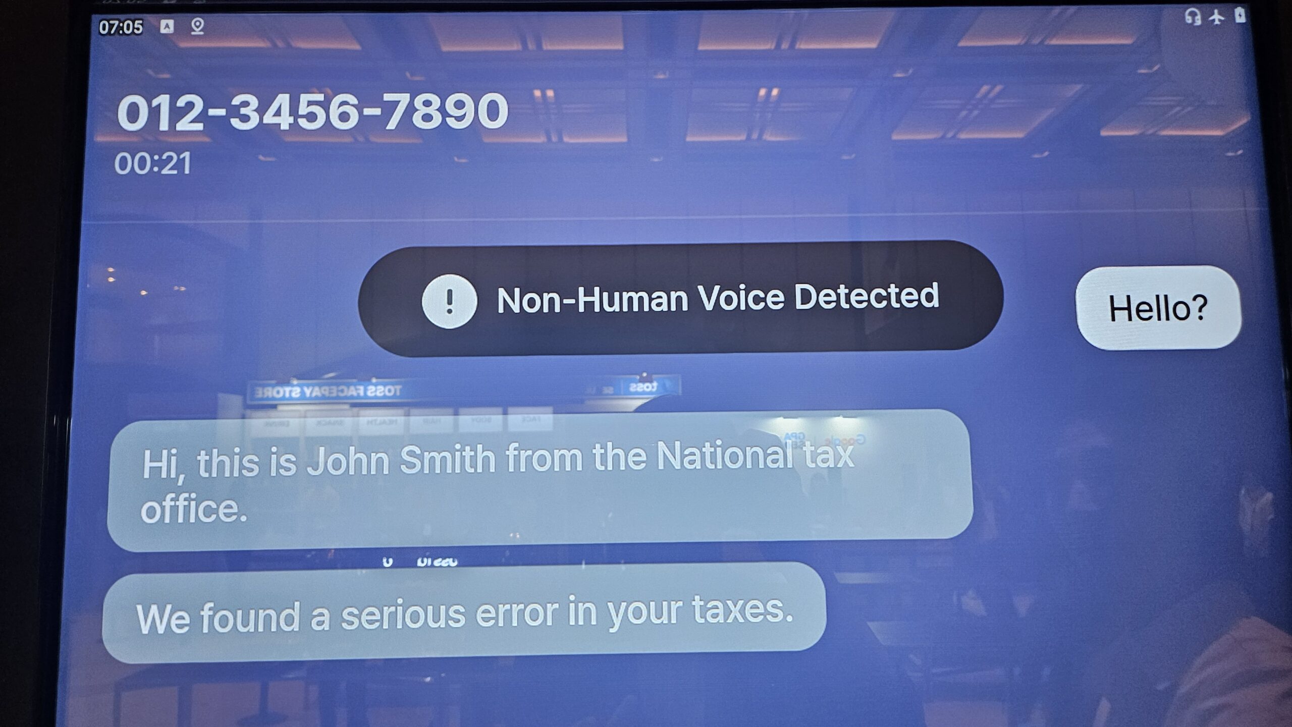 두 번째는 LG유플러스의 AI 통화 비서 앱 ‘익시오(ixi-O)‘에 탑재된 보이스피싱 탐지 기술, ‘AI 콜 에이전트(AI Call Agent)’ 기능이다. 낯선 번호가 걸려오자, 화면에는 “스팸 전화(Likely Spam Call)”라는 문구가 뜨며 피싱 위험 신호를 알려준다. 이어 통화 내용을 실시간 자막으로 변환하면서, 대화 중 의심스러운 단어가 등장할 경우 추가로 알림을 준다.