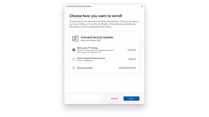 개인 사용자는 ▲윈도우 백업을 통한 설정 클라우드 동기화(추가 비용 없음) ▲마이크로소프트 리워드 포인트 1000점 사용(추가 비용 없음) ▲유료 결제(3만7900원) 중 하나를 선택할 수 있다. 등록 기간은 2025년 10월 15일부터 2026년 10월 13일까지다.