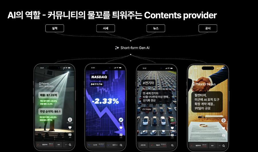 “결국 콘텐츠와 커뮤니티라고 판단했습니다. 우리가 증권사 커뮤니티 앱을 만들었으니까 들어오세요 했을 때, AI 기반으로 영상을 자동으로 만들고 이 영상이 물꼬를 틔워주는 역할을 했던 거고요. 그렇게 물꼬가 틔워지면 다양한 인간 크리에이터들이 들어와 영상을 만들텐데, 한발 더 나아가 AI 크리에이터들이 시황 정보나 뉴스가 들어올 때마다 영상을 자동으로 찍어내는 작업들을 하고 있습니다. 그 외에도 AI 크리에이터들이 자신의 콘셉트에 맞게 영상을 자동 생산하는 방식을 진행하고 있습니다.”