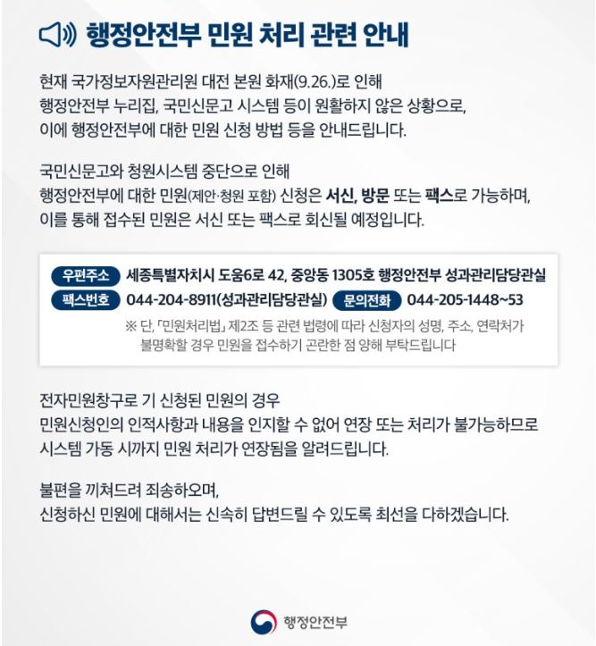 행안부 홈페이지나 국민신문고 먹통으로 인해 민원 신청은 서신, 방문 또는 팩스로 가능하다. 접수된 민원 역시 서신 또는 팩스로 회신될 예정이다.