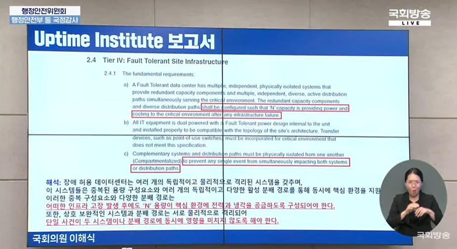그는 “한국전기설비규정에는 UPS 기준은 있지만 냉각 설비 기준은 없다”며 “전력은 이중화돼 있지만 냉각 시스템은 단일화돼 있다”고 설명했다.