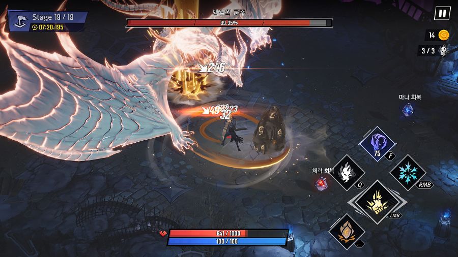 이용자는 대시/일반공격/특수공격의 세 가지 버튼만을 활용해서 전투를 진행하지만, ‘성진우’가 선택하는 무기와 버프에 따라 묵직한 타격감부터 극한의 속도감까지 다채로운 액션을 즐길 수 있다. 시연 버전에서 대시와 동시에 권법이 나가는 능력치를 활용했더니 그야말로 극한의 속도전을 즐길 수 있었다.