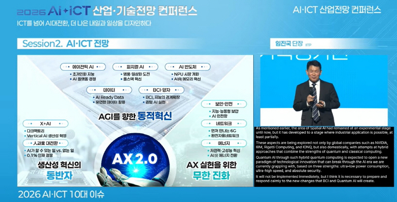 AI 국가 대전이 펼쳐지고 있다고 할만큼 치열한 경쟁 환경에서 ‘AI 대전환’이 더욱 가속화될 2026년 주목할 10가지 AI·ICT 핵심 이슈로 임 단장은 ▲에이전틱 AI-AI 페르소나가 온다 ▲피지컬 AI, 움직이는 모든 것으로 ▲학습에서 추론으로, AI반도체 대전환 ▲이제는 AI 레디 데이터(AI Ready Data) 시대 ▲모든 곳의 생산성 혁명 ▲AI가 이끄는 사람과 업의 대전환 ▲AI 방패, 보안이 안보가 된다 ▲네트워크도 자율행동으로 간다 ▲에너지, 지속가능 혁신의 키, 그리고 새롭게 부상하는 기술로 ▲더 뉴 웨이브(The New Wave), 뇌-컴퓨터인터페이스(BCI)·퀀텀 AI를 꼽았다.