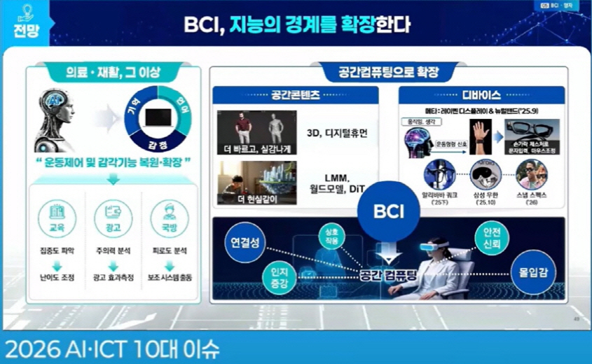 BCI는 사람의 생각을 기계와 연결시키는 인터페이스 기술로 주목 받고 있다. 지금까지는 BCI가 뇌파를 측정하고 분석하는 데 많은 어려움이 있었다. 앞으로 AI 기술을 활용해 훨씬 더 용이하고 더 정밀해질 수 있는 BCI 기술의 혁신이 본격화되고 있다. BCI 기술은 그동안 운동 제어나 감각 기능을 복원하는 용도로 많이 활용이 됐다. 근래에는 기억이나 언어, 감정을 전달하고 기계와 소통할 수 있는 매개체로써 주목 받으면서 교육이나 광고, 국방에 이르기까지 활용 영역을 넓히고 있다. 특히 최근의 AI 기술의 발전, 올드 모델과 3D 생성과 같은 기술의 발전은 공감 콘텐츠라는 새로운 콘텐츠 영역을 개발하고 발전시키고 있다. 최근에는 BCI와 연결된 디바이스의 혁신도 병행해서 진행 되고 있다. 콘텐츠와 디바이스 혁신 매개체로 BCI가 연결이 될 때 앞으로 사람은 새로운 공간 컴퓨팅이라는 새로운 현실을 맛볼 수 있지 않을까 한다. 생각하는 게 바로 현실이 되고 그런 것들이 현실과 구분할 수 없을 정도의 고품질로 디스플레이에 펼쳐지는 공간 컴퓨팅의 시대도 조만간 다가올 것으로 예상된다. 이러한 종합적인 기술적인 측면에서도 대응이 필요할 것 같다.