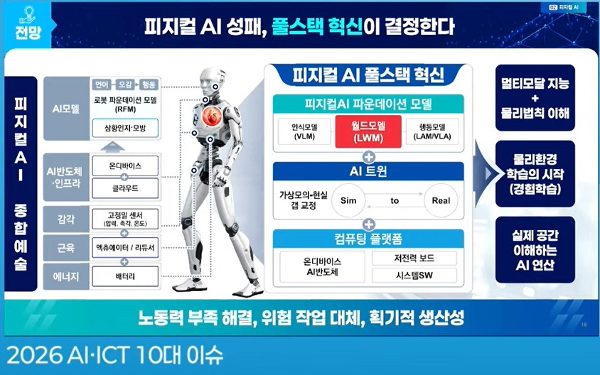 피지컬 AI 기술의 발전은 이제 앞으로 전개될 로봇, 택시나 드론이나 유에 같은 움직이는 모든 것의 구동 방식을 바꾸면서 우리 일상에 새롭게 다가올 것으로 보인다. 기술적 측면에서도 피지컬 AI는 종합 예술이라고 할 수 있다. 인간의 두뇌를 담당하는 AI, 그리고 실제 감각을 담당하는 센서, 근육을 담당하는 액추에이터, 그리고 에너지를 담당하는 배터리까지 여러 기술이 결합된 종합 예술이다. 이 피지컬 AI 경쟁력은 이러한 피지컬 AI 분야에 있어서의 어떤 이러한 기술들을 효과적으로 제휴하고 관리하고 발전시킬 수 있는 풀스택(Full-Stack)을 갖추는 데 있을 것이다. 비전언어모델(VLM) 등과 같은 AI 모델을 기반으로 피지컬 AI에 대한 ▲특화된 파운데이션 모델 기술, 이러한 모델이 실제 사람과 자연스럽게 얼라이언스를 맞춰나가기 위해 지속적으로 학습하고 현실과의 갭을 줄여나가는 ▲AI 트윈, 그리고 이런 것들이 안정적으로 운영되고 제어할 수 있는 온디바이스 AI, 반도체나 시스템 소프트웨어까지 이러한 기술들을 고루 갖춘 ▲풀스택 혁신이 앞으로 전개될 피지컬 AI의 어떤 성패를 좌우하게 될 것이다.