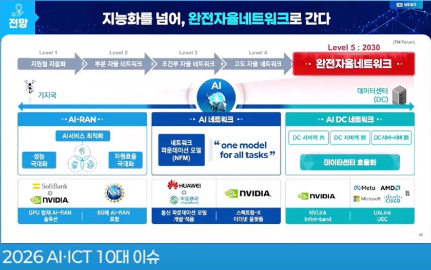 네트워크의 혁신 기술 면에서는 ‘완전 자율 네트워크’에 주목할 필요가 있다. 그동안 네트워크는 세대 변화에 따라서 이런 하드웨어 중심의 장비사가 주도하는 혁신, 오픈 랜(Open RAN)이나 AI RAN 중심으로 전환이 되면서 소프트웨어나 AI 기업이 주도하는 혁신체계로 전환되고 있다. 그동안 대부분 기지국(RAN)에 집중돼 경쟁 체제가 형성돼 왔다. 이를 통해 AI 서비스의 최적화나 네트워크 서비스 성능의 극대화, 네트워크 기지국의 가용 자원의 효율을 최대화시키는 부분에 집중해서 네트워크의 혁신이 전개돼 왔다. 이제는 AI 기술 발전에 따라서 네트워크 전주기를 관장할 수 있는 AI 기술 모델의 발전과, 백본부터 기지국까지 전주기적인 혁신이 전개될 것이다. 실제 AI 전체 네트워크를 관장하는 AI 네트워크 파운데이션 모델 또한 특화된 분야에서 가장 중요하고도 유망한 분야가 될 것이다. 말단의 기지국뿐만이 아니라 시작점이라고 할 수 있는 백본망에서 AI 데이터센터 네트워크의 어떤 혁신 또한 더욱 빠르게 전개될 것이다.