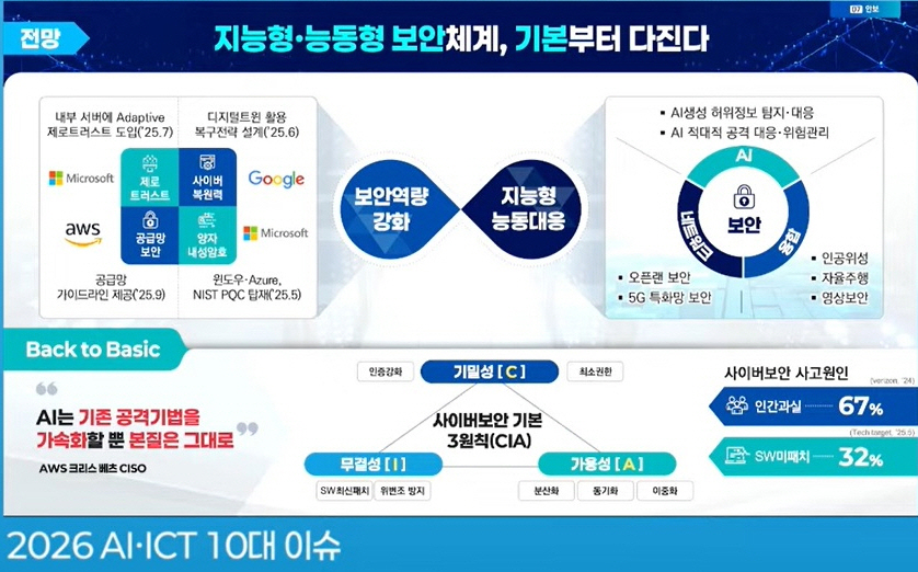 AI 대전환이라는 새롭게 바뀌는 환경에서의 보안 역량의 강화, 제로트러스트나 사이버 복원력의 확보, 공급망 보안은 보안 영역의 필수적인 요소로 자리 잡을 것이다. 그리고 AI를 활용한 지능화된 보안 체계, 네트워크와 융합 보안에 이르기까지 지능형 능동 대응은 아주 중요한 AI 대전환 시대의 핵심 인프라가 될 것이다. 하지만 그 과정에서 우리는 기본을 놓치지 않아야 될 것 같다. 백투베이직(Back to Basic)이다. 실제 AI는 기존 공격 기법을 그대로 가속화할 뿐 그 본질은 변하지 않는다고 한다. 최근에 일어나고 있는 사이버 침해 사고 또한 소프트웨어를 패치하지 않았거나 사람의 과실로 일어난 문제들이 상당수다. 아무리 지능화된 어떤 고도화된 보안 체계를 갖췄다 하더라도 이런 기본이 지켜지지 않았을 때 그런 보안 위협은 여전히 상존하게 된다. 기밀성, 무결성 가용성이라는 보안의 기본 원칙을 유지, 강조하면서 다양한 지능화된 환경에서의 새로운 보안 체계의 변화 부분들을 정보 사이버 보안 분야에서 주목해서 살펴봐야 할 것이다.