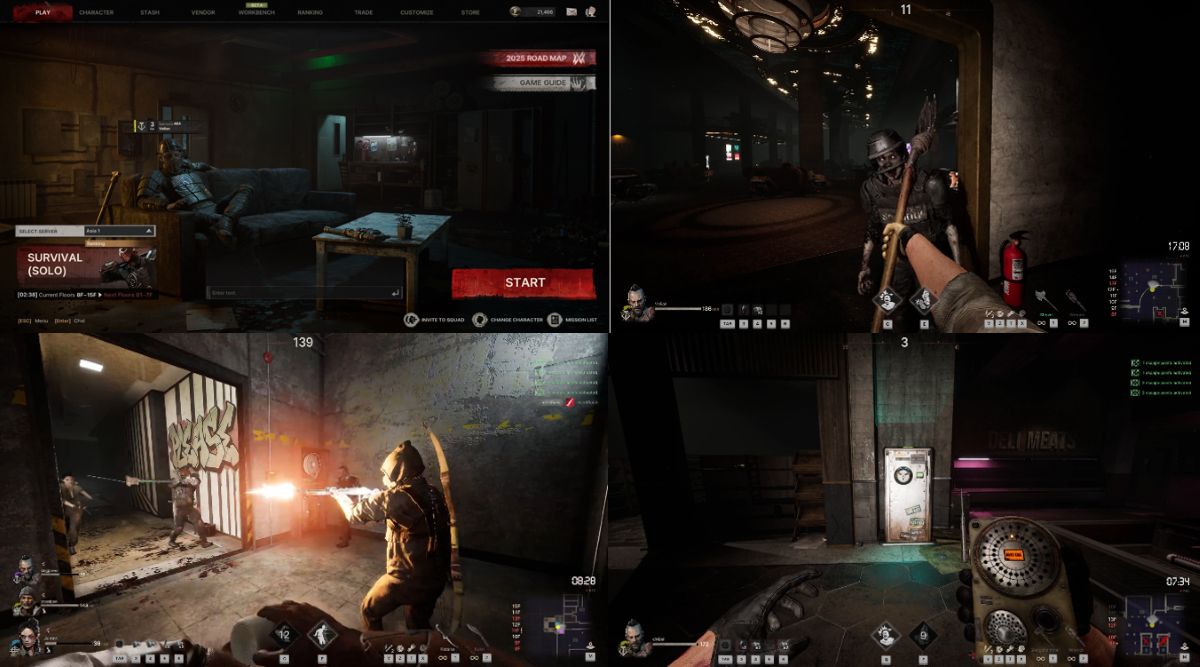 게임의 전장은 시간이 지남에 따라 각 층이 순차적으로 폐쇄되며 플레이 가능한 공간이 점진적으로 축소되는 구조로 설계했다. 플레이어는 제한된 공간 안에서 동료와 협력해 전리품과 자원을 확보하는 동시에 다른 유저와 조우하거나 대치하는 상황에 놓이게 된다. 이를 통해 협동 플레이와 전략적 판단, 액션 요소가 유기적으로 결합된 긴장감 있는 플레이 경험을 선사한다.