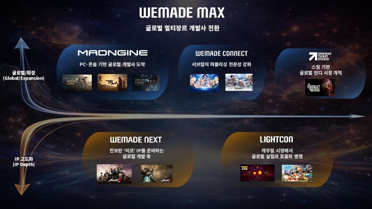 위메이드맥스 산하 5개 핵심 스튜디오는 ▲매드엔진 ▲위메이드커넥트 ▲위메이드넥스트 ▲원웨이티켓스튜디오 ▲라이트컨으로 올해 순차적으로 신작을 낸다.