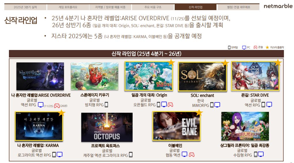 넷마블은 25년 4분기에 ▲나 혼자만 레벨업:ARISE OVERDRIVE를 출시할 계획이며, 26년에는 ▲스톤에이지 키우기 ▲일곱 개의 대죄: Origin ▲SOL: enchant ▲몬길: STAR DIVE ▲나 혼자만 레벨업: 카르마 ▲이블베인 ▲샹그릴라 프론티어: 일곱 최강종 ▲프로젝트 옥토퍼스 등 총 8종의 기대 신작을 선보일 예정이다.